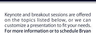 RETURN TO HOMEPAGE, click here. SCHEDULE BRYAN TO SPEAK AT YOUR EVENT, click here. CUSTOMIZE YOUR PRESENTATION, click here. ABOUT BRYAN, click here. TO CONTACT US, click here.
