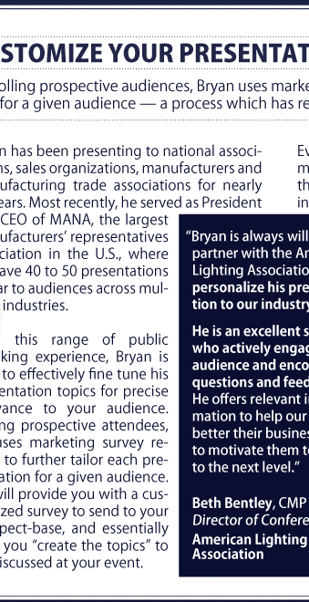 RETURN TO HOMEPAGE, click here. SCHEDULE BRYAN TO SPEAK AT YOUR EVENT, click here. CUSTOMIZE YOUR PRESENTATION, click here. ABOUT BRYAN, click here. TO CONTACT US, click here.